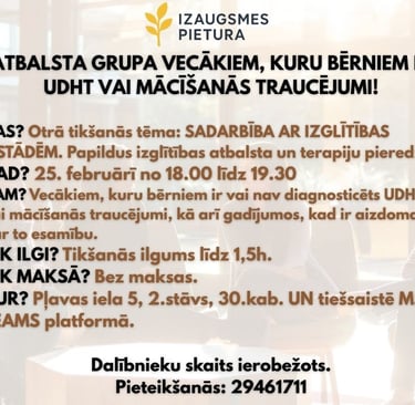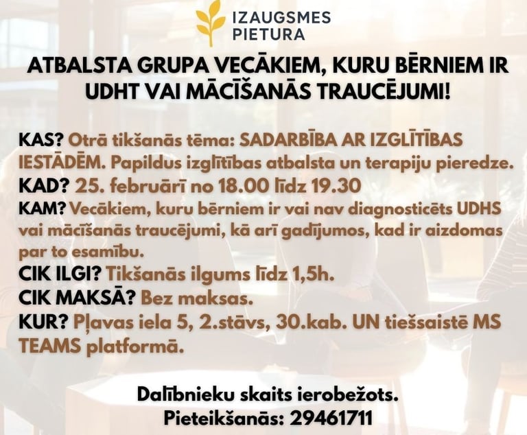 Šī ir BEZMAKSAS atbalsta grupa vecākiem, kuru bērniem ir vai nav diagnosticēts UDHS vai mācīšanās traucējumi, kā arī gadījumos, kad ir aizdomas par to esamību. Atbalsta grupas tikšanās notiek vienu reizi mēnesī.